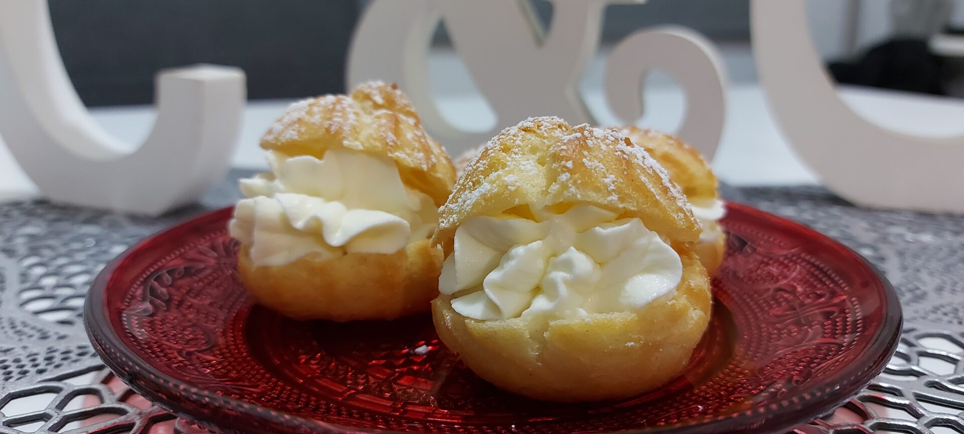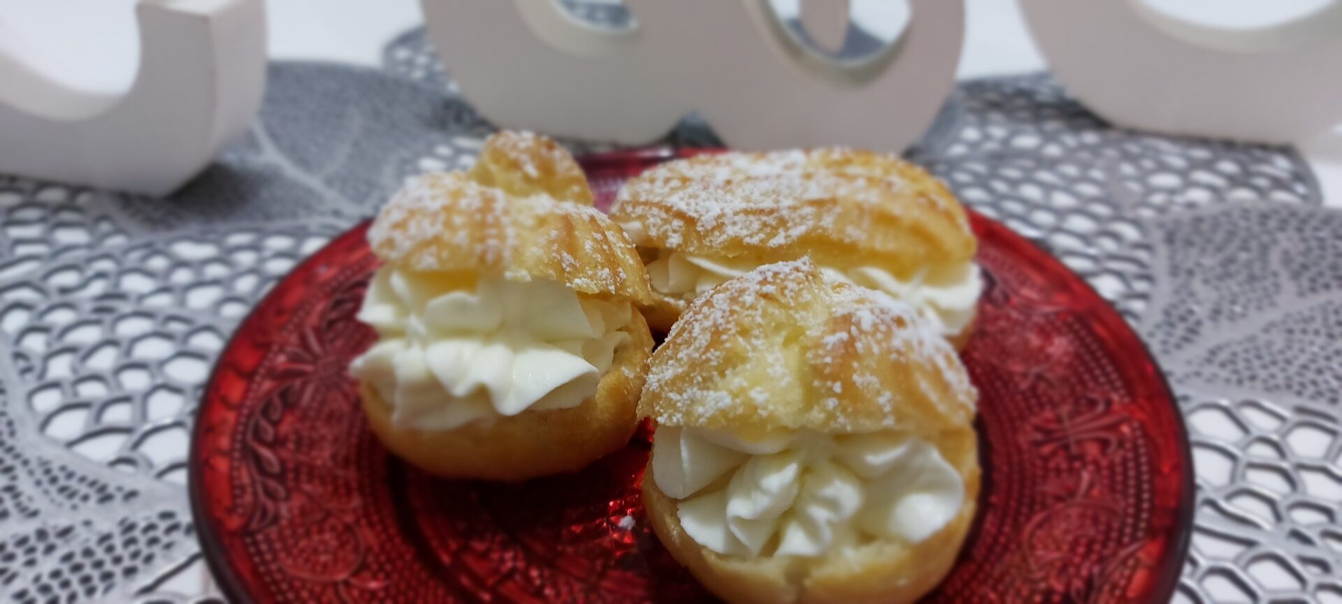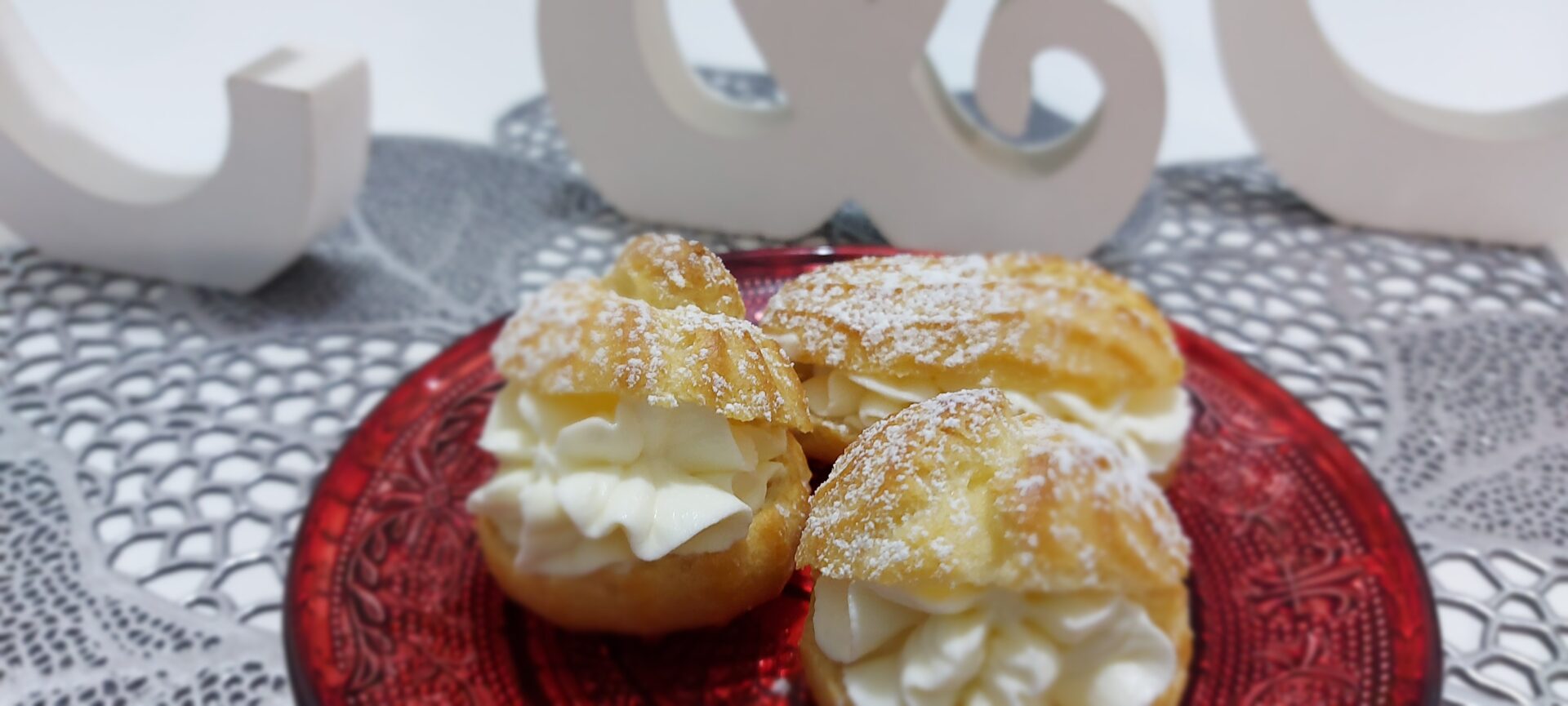 Antes de preparar la pasta choux, precalentamos el horno a 190ºC. En un cazo ponemos a calentar la mantequilla con el agua y la sal. Al hervir lo sacamos del fuego y añadimos la harina de golpe. Mezclamos bien hasta que se forme una bola y, tras esto, vamos añadiendo los huevos uno a uno. Ponemos la masa en una manga pastelera con boquilla lisa y en una bandeja de horno vamos haciendo pegotes. Lo metemos al horno a 200ºC durante 30 minutos. Después de hornearlas las dejamos enfriar, partimos por la mitad y las rellenamos con nata montada o Chantilly. Decoramos con azúcar glas por encima.