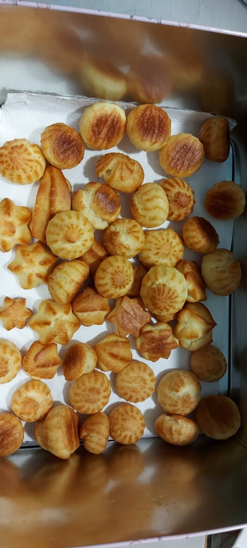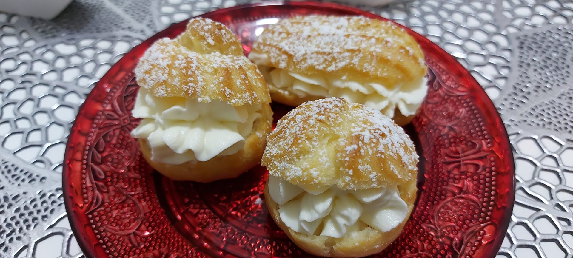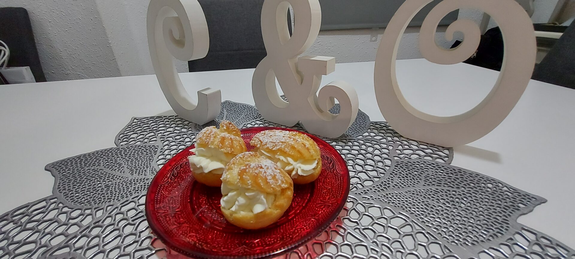 Antes de preparar la pasta choux, precalentamos el horno a 190ºC. En un cazo ponemos a calentar la mantequilla con el agua y la sal. Al hervir lo sacamos del fuego y añadimos la harina de golpe. Mezclamos bien hasta que se forme una bola y, tras esto, vamos añadiendo los huevos uno a uno. Ponemos la masa en una manga pastelera con boquilla lisa y en una bandeja de horno vamos haciendo pegotes. Lo metemos al horno a 200ºC durante 30 minutos. Después de hornearlas las dejamos enfriar, partimos por la mitad y las rellenamos con nata montada o Chantilly. Decoramos con azúcar glas por encima.